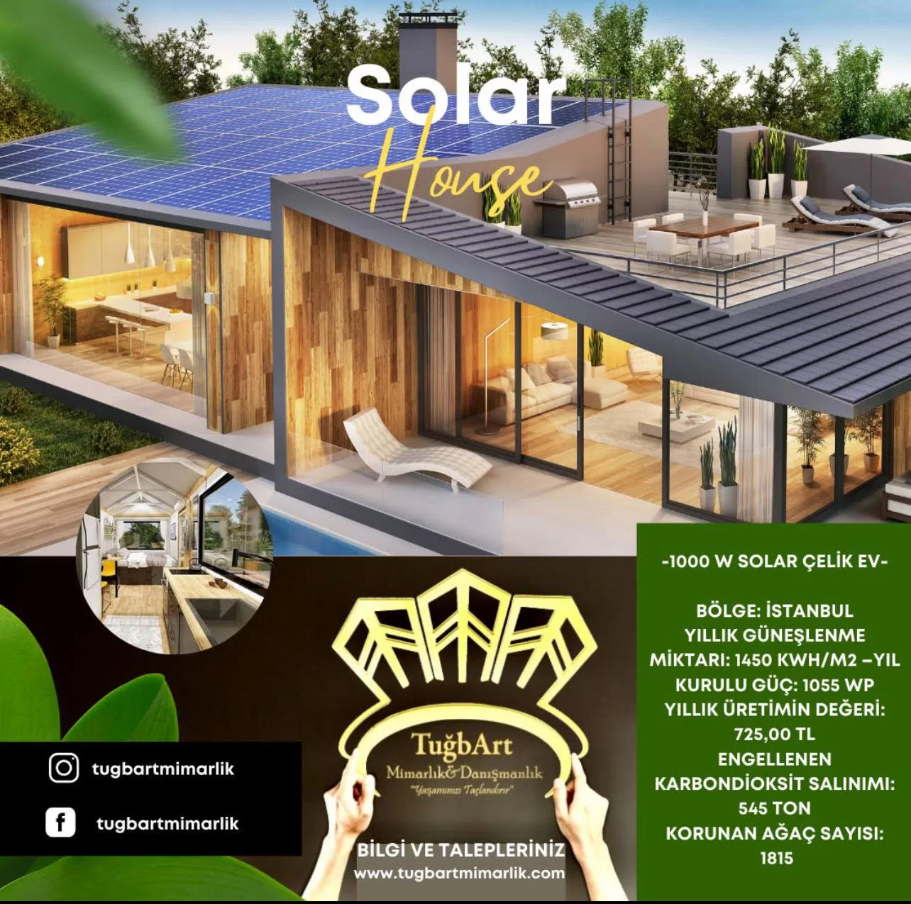1000 Kw'lik solar ev bir yıl içerisinde 545 tonluk karbondioksit salınımı engellenmektedir .Bu özelliği tasarruf ederken çevreyi koruma deneyimini sizlere yaşatmış olacaktır.